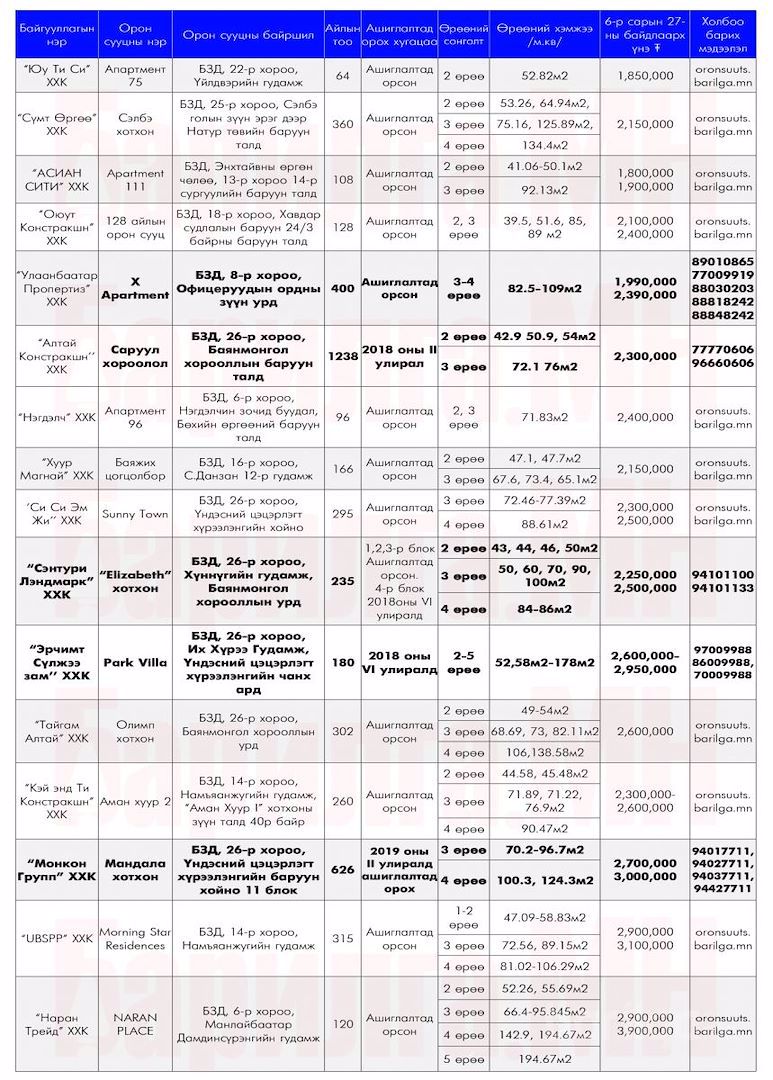 УЛААНБААТАР ХОТОД ЗАХИАЛГА АВЧ БУЙ ШИНЭ ОРОН СУУЦНЫ МЭДЭЭЛЭЛ 2018 оны 6 сарын 25-ны байдлаар