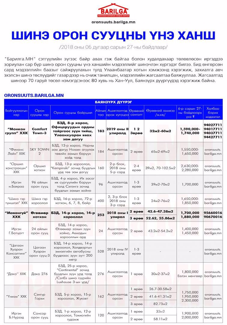 ШИНЭ ОРОН СУУЦНЫ үнэ ханшийн мэдээллийг