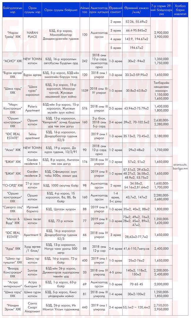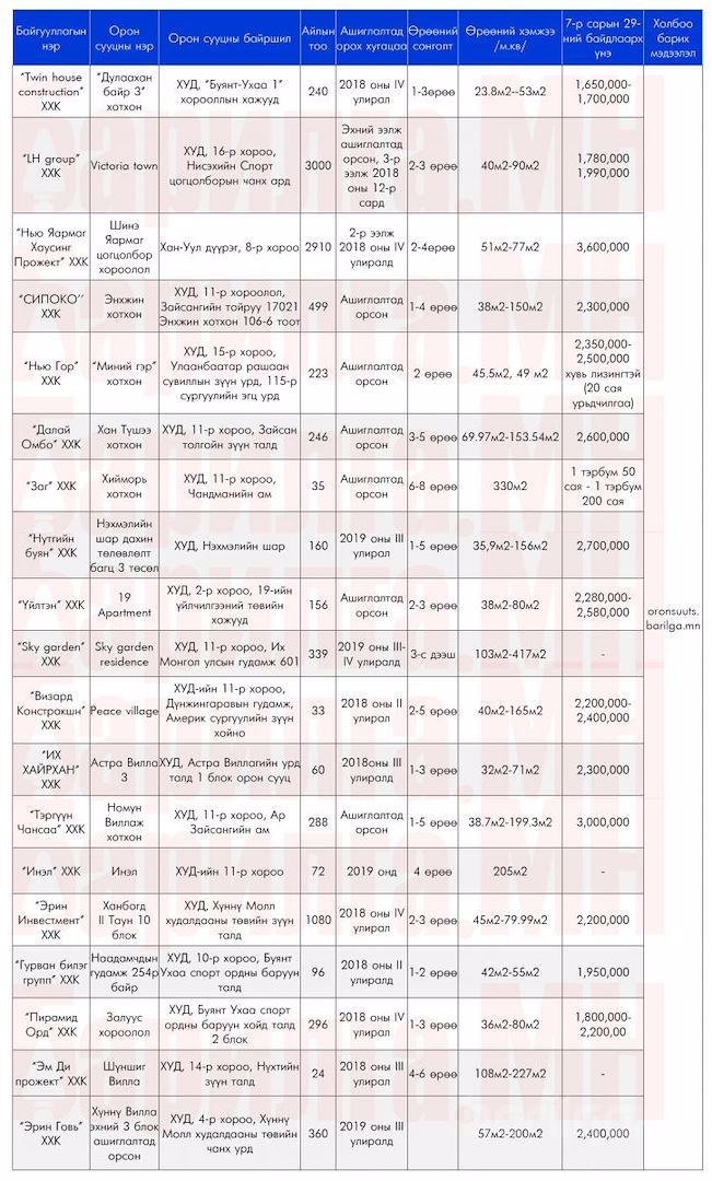 Улаанбаатар хотод захиалга авч буй Шинэ Орон Сууцны мэдээлэл 8 сарын 1-ний байдлаар