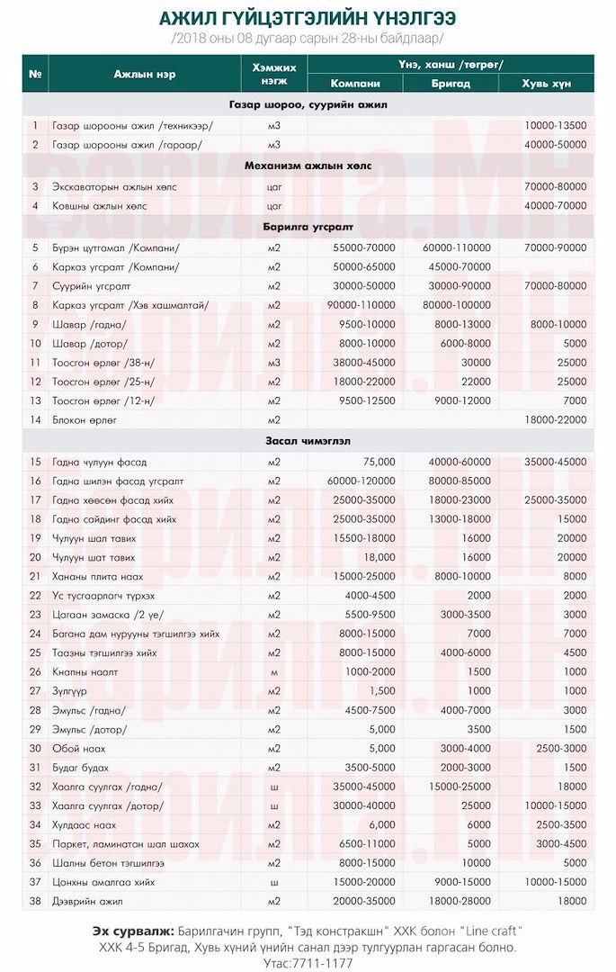 сэтгүүлээс сар бүр хүргэдэг барилгын ажил гүйцэтгэлийн үнэ ханшийн мэдээллийг уншигч танд хүргэж байна. Илүү дэлгэрэнгүй мэдээлэл авахыг хүсвэл манай сэтгүүлийн 2018 оны 9-р сарын дугаар №100-aaс үзэх боломжтой.