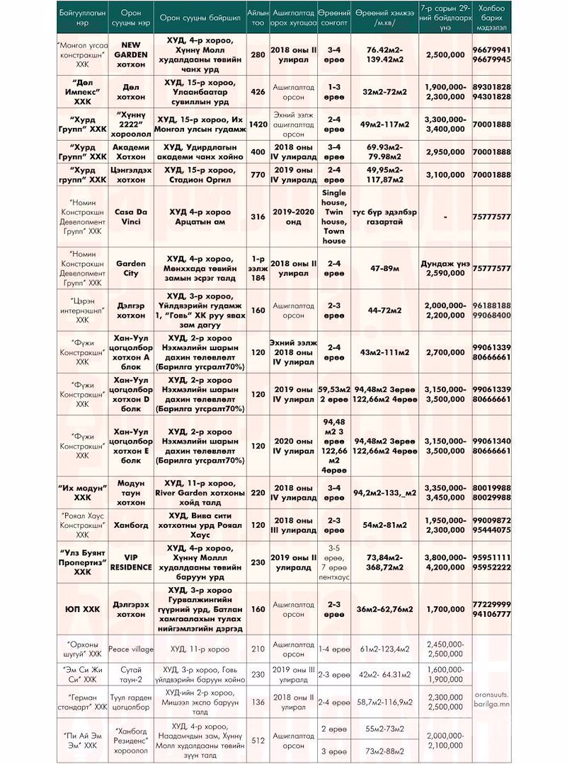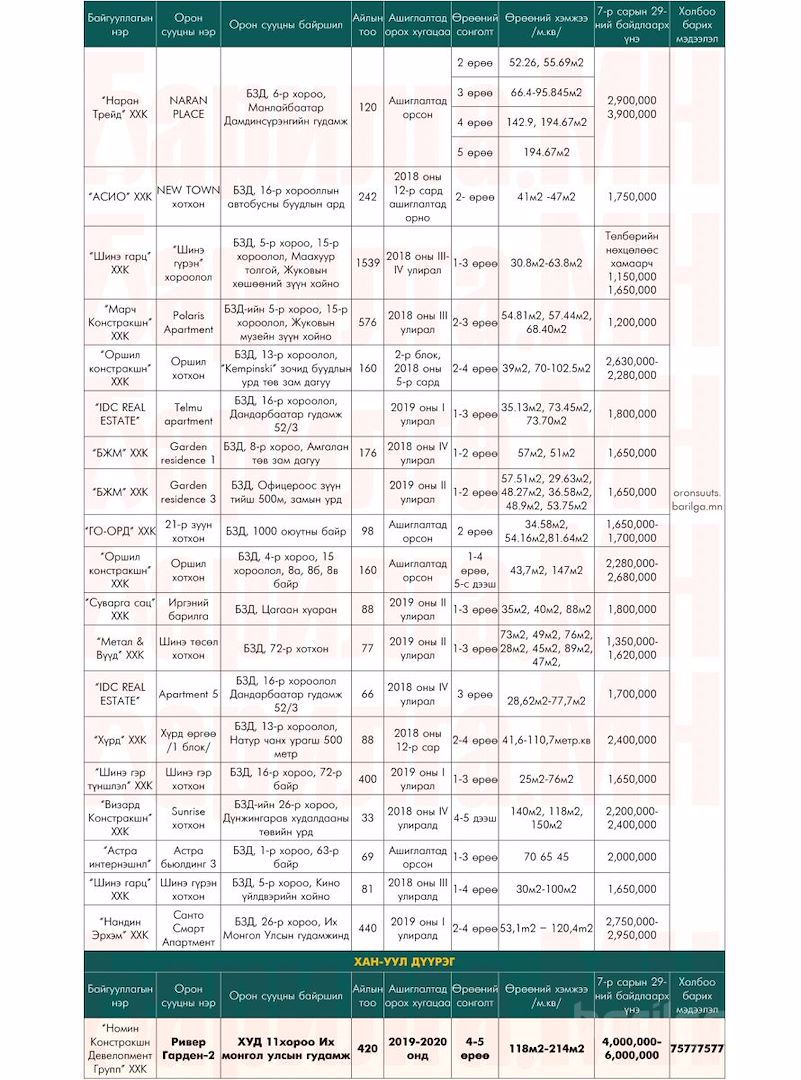 Улаанбаатар хотод захиалга авч буй Шинэ Орон Сууцны мэдээлэл 9 сарын 1-ний байдлааp