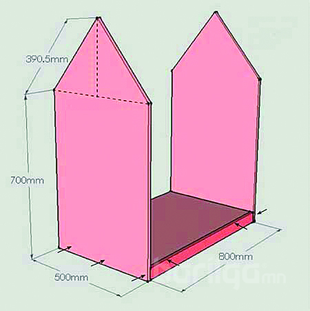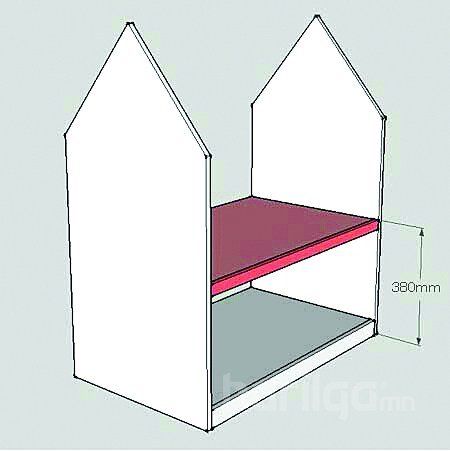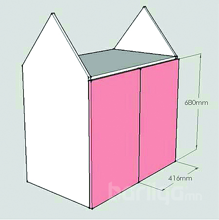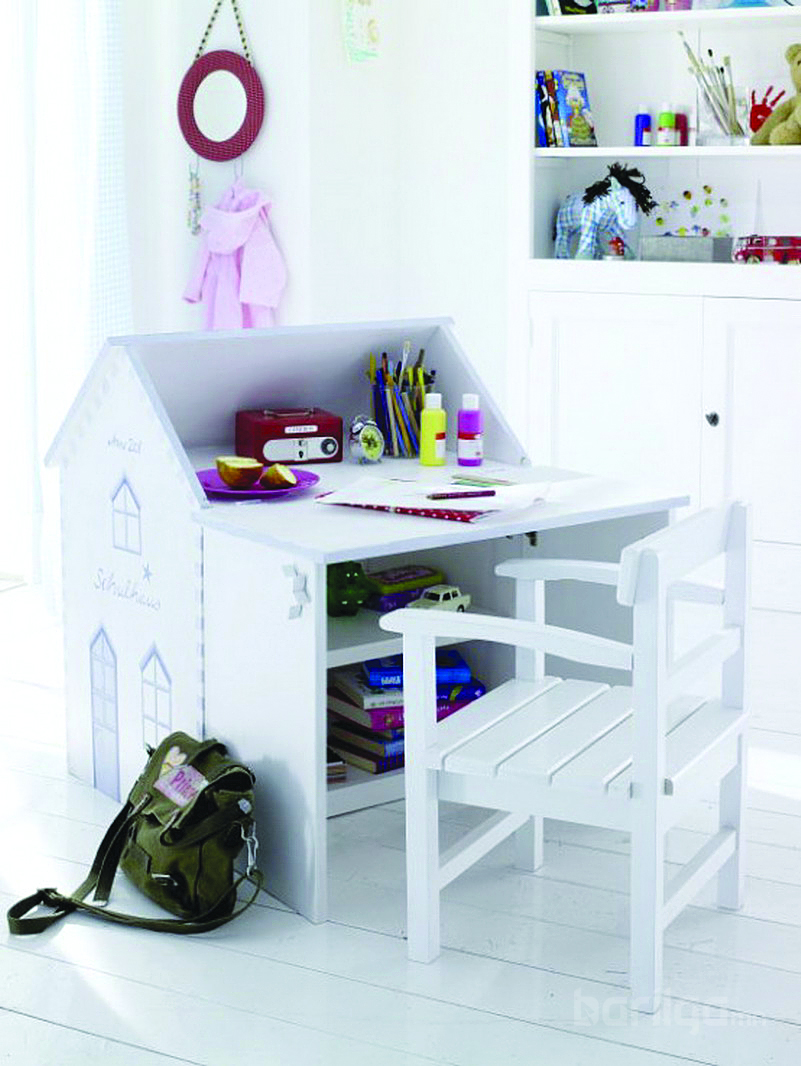 650мм урттай нугасны тусламжтай шүүгээний 2 хаалгыг бэхлэх ба энэ нь онгойх үед ширээний тулгуур хөл болно. Ширээний тавцанг тулгуур хөлтэй нь түгжээгээр холбож тогтвортой хөдөлгөөнгүй болгоно. Бяцхан байшингийнхаа дээврийн хөндийг ашиглан үзэг харандаа, ном дэвтэр, тоглоомоо тавьж болно. Эцэст нь өөрсдийн хүссэн өнгөөр будаж хаалганы бариул гэх мэт гоёмсог хэрэгслүүдийг тогтоож ширээ бэлэн болно.