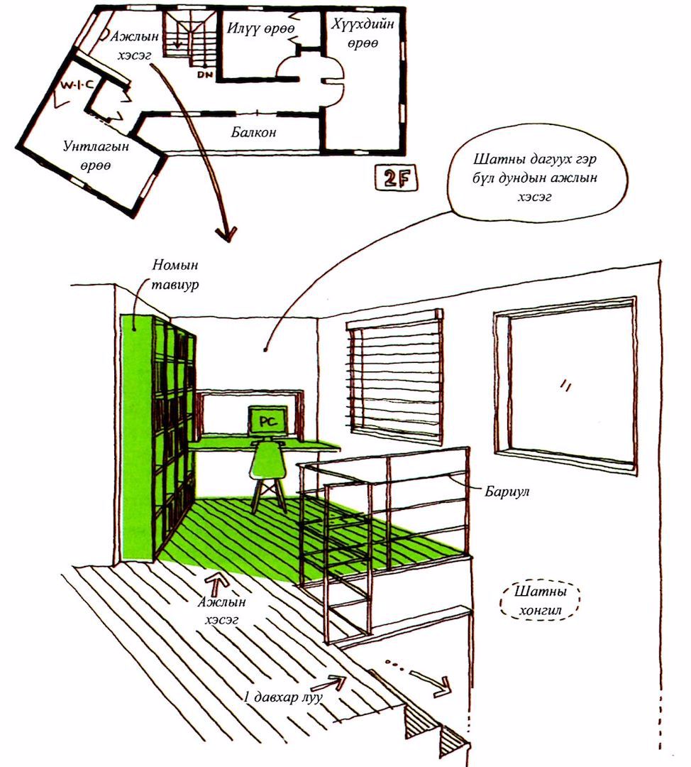 Шатны дээд буланг ажлын хэсэг болгон тохижуулсан байгаа нь. Томчуудаас гадна хүүхдүүд ч компьютер ашиглан сууцгаана. Нүдний өмнө цонх байгаа нь битүү мэдрэмжийг арилгаж, тааламжтайгаар ажиллах орчин болж чаджээ. “Гэрийн хаа нэг дундын хэрэглээний ажлын хэсэгтэй баймаар байна”, “Гэр бүлийнхэн нэг мэдэхэд цуглачихдаг, хоорондоо харилцдаг тийм хэсгийг бүрдүүлмээр байна” хэмээн ярих хүмүүс нэлээдгүй. Энэ үүднээс хооллож амрах өрөө буюу хэлж заншсанаар LD-ийн нэг буланд компьютерийн ширээ байрлуулах буюу коридорыг өргөн төлөвлөөд хичээлийн булан гаргах гээд янз бүрийн санааг хэрэгжүүлдэг болсон.