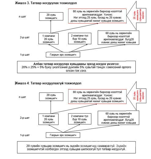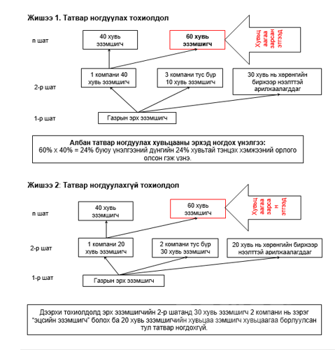 Хувьцаа эзэмшигчийн орлогыг албан татварын үнэлгээг тооцохдоо тухайн хувьцааны хэмжээгээр хувь тэнцүүлэн орлогын хэмжээг тооцно. Жишээлбэл,
