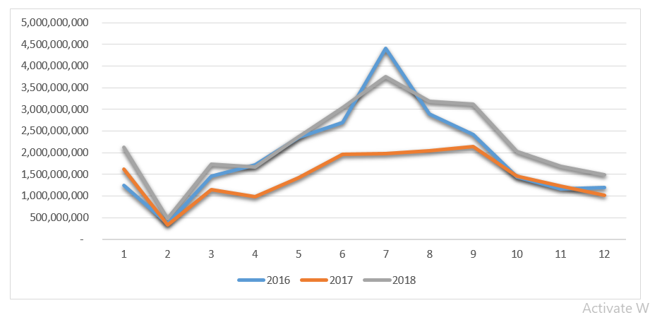 Зураг 3. Чулуун эдлэлийн импорт, мөнгөн дүнгээр, 2016-2018 он, сая төгрөг