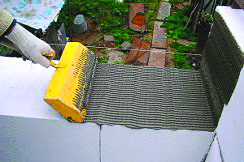 6. Бэлтгэсэн цавуугаа хамгийн ихдээ 2-3 блокны гадаргуу дээр бүхэлд нь 3 мм-ээс ихгүйгээр зузаан жигд түрхэнэ. Ингэхдээ блокны өргөний хэмжээнд тохирсон зориулалтын шанаган багаж ашиглаж болно. Бэлэн болсон зуурмагийг зориулалтын шанаган багаж ашиглан блокон дээрээ жигд татна. Жигд татсан цавуун дээр блокыг наасны дараа нэг бүрчлэн тэгш усаар хэмжинэ. Технологийн дагуу ховилгүй блокын нийлэх хэсгийн босоо заадаст цавууг нийвийний тусламжтайгаар гадаргүу дээр жигд тарааж түрхэнэ.