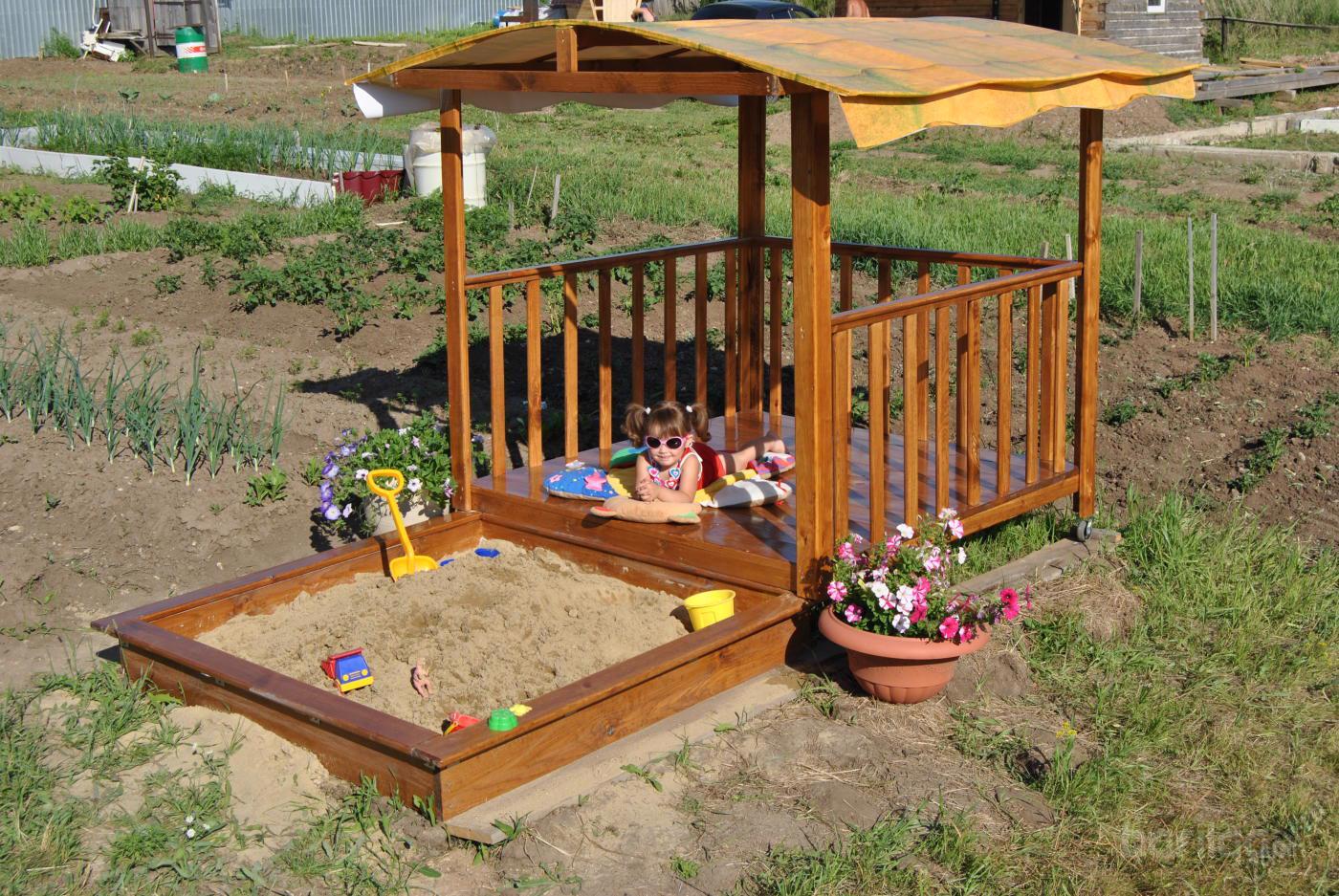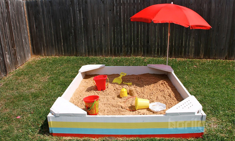 Дөрвөн буландаа суух тавцантай хоёр буландаа нарнаас хамгаалах шүхэр байрлуулсан элсний хайрцаг ч үзэмжтэй бөгөөд хийхэд хялбархан.