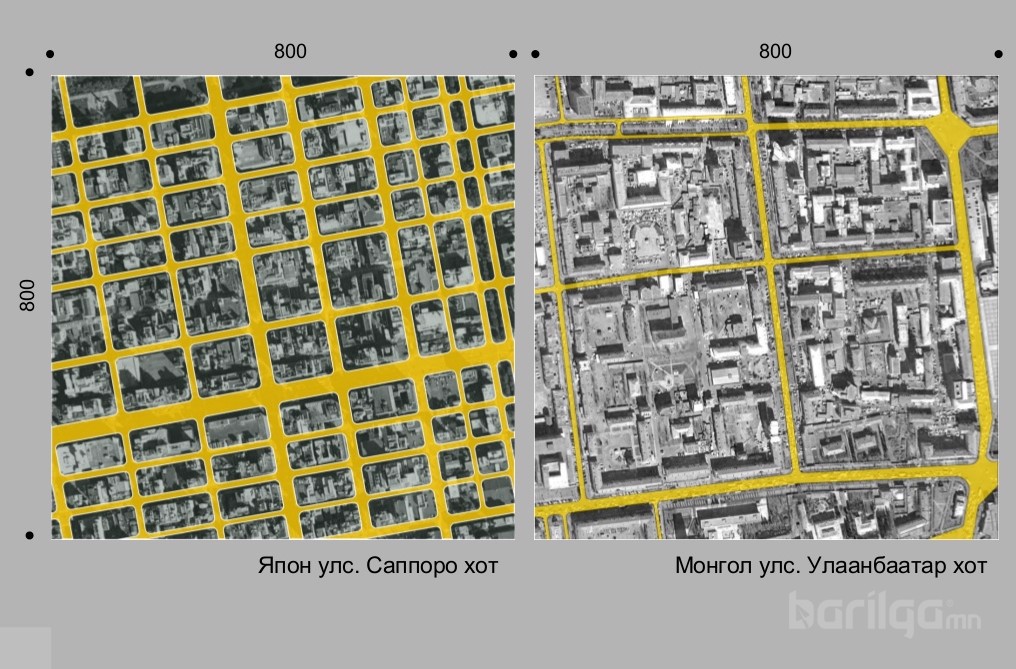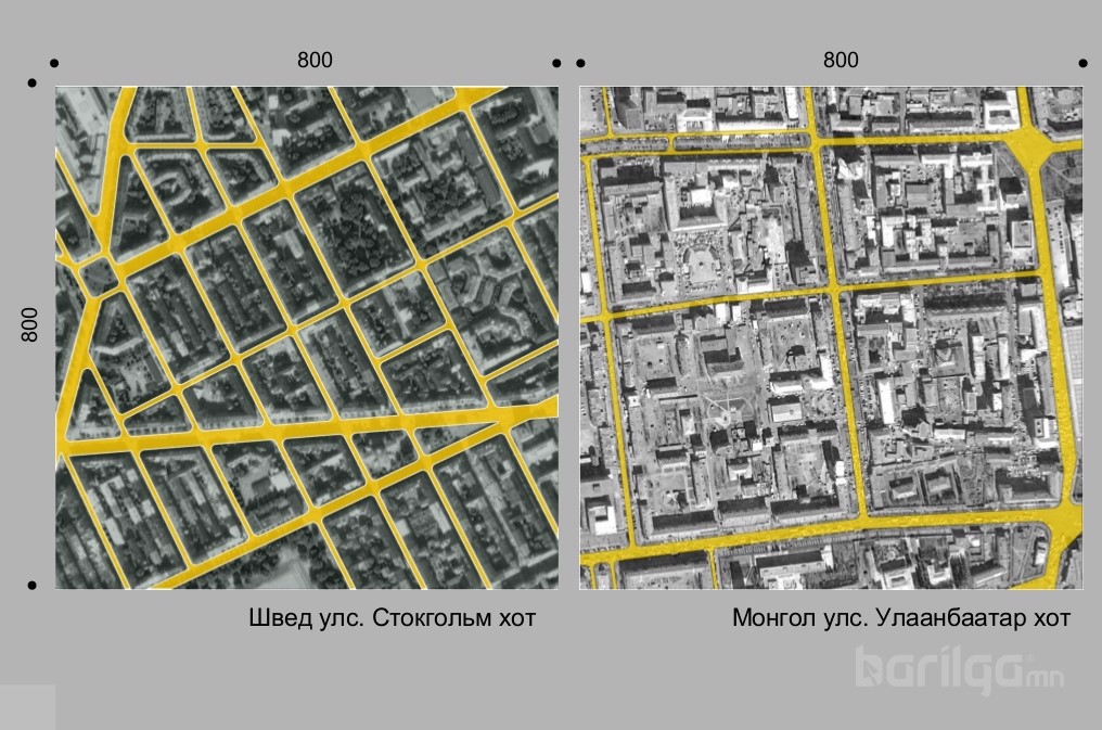 төвийн хэсгийг яг ижил масштабаар хааш хаашаа 800 метр хавтгай дөрвөлжин талбайд Улаанбаатар хотын төвтэй харьцуулж үзүүлсэн байна.