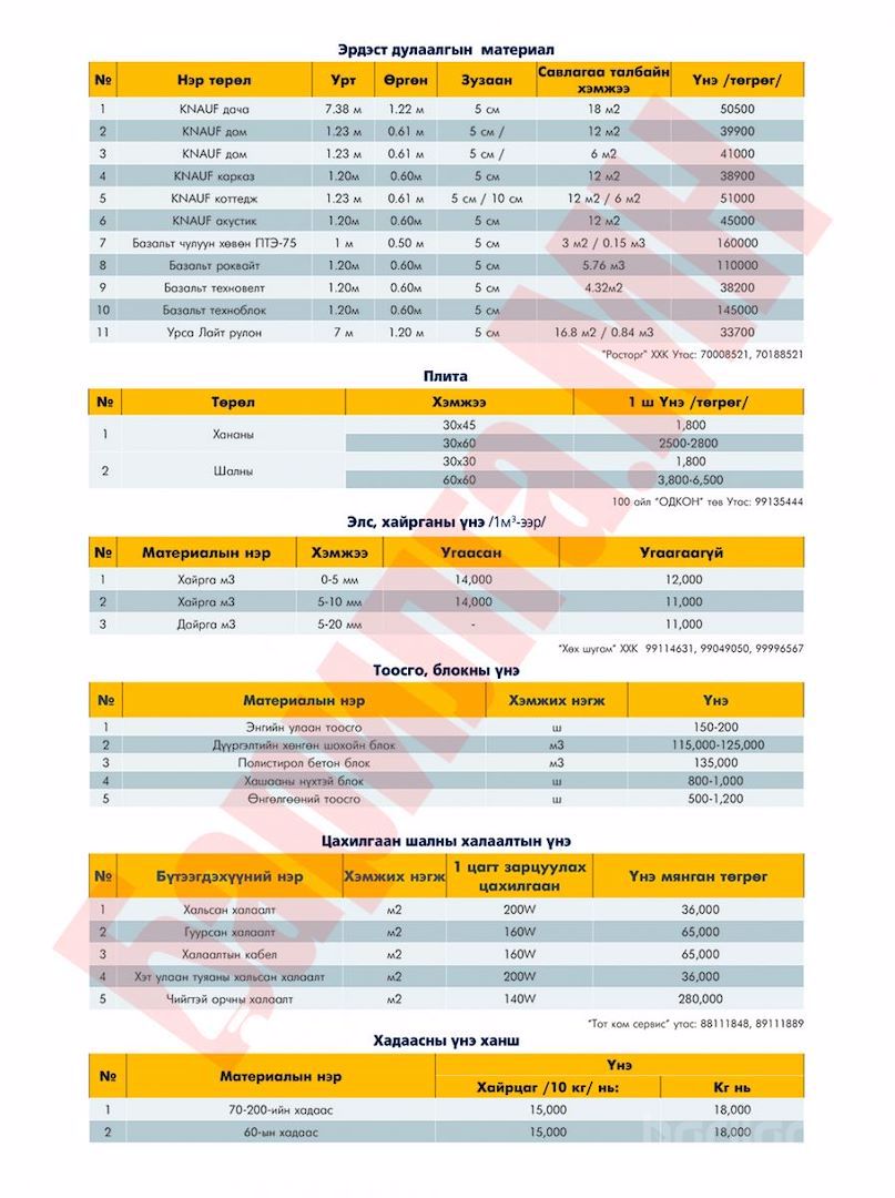 сэтгүүлээс сар бүр хүргэдэг барилгын материалын үнэ ханшийн мэдээллийг уншигч танд хүргэж байна. Илүү дэлгэрэнгүй мэдээлэл авахыг хүсвэл манай сэтгүүлийн 2017 оны 3-р сарын дугаар №82-ooс үзэх боломжтой.