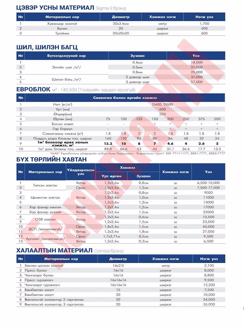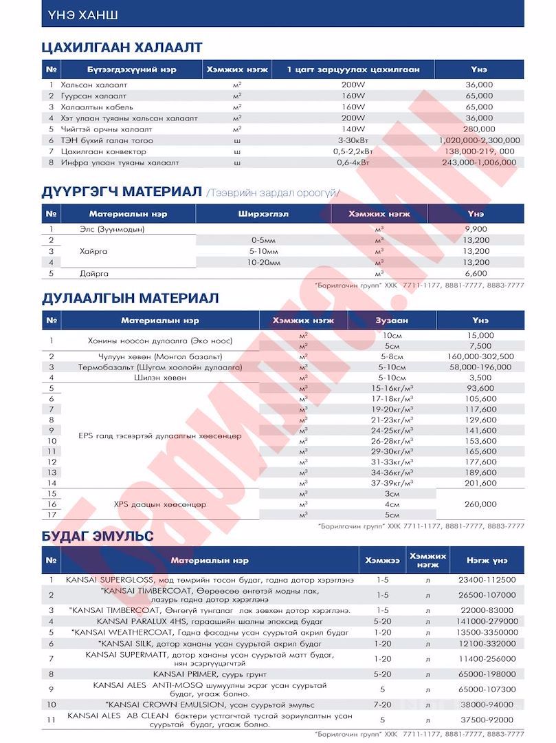 сэтгүүлээс сар бүр хүргэдэг барилгын материалын үнэ ханшийн мэдээллийг уншигч танд хүргэж байна. Илүү дэлгэрэнгүй мэдээлэл авахыг хүсвэл манай сэтгүүлийн 2017 оны 11-р сарын дугаар №90-ээс үзэх боломжтой.