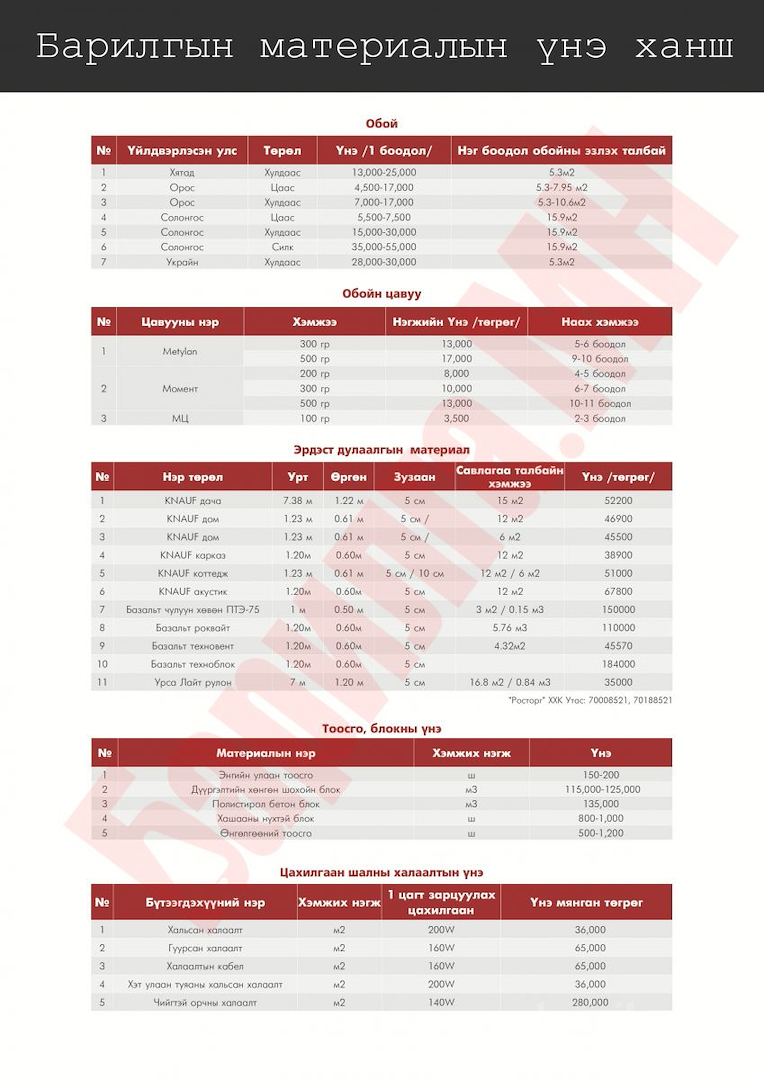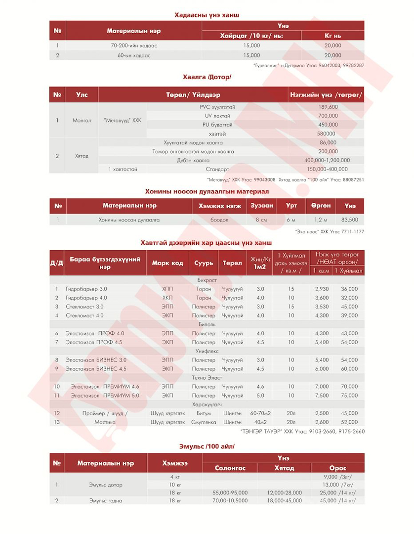 сэтгүүлээс сар бүр хүргэдэг барилгын материалын үнэ ханшийн мэдээллийг уншигч танд хүргэж байна. Илүү дэлгэрэнгүй мэдээлэл авахыг хүсвэл манай сэтгүүлийн 2017 оны 6-р сарын дугаар №85-aaс үзэх боломжтой.