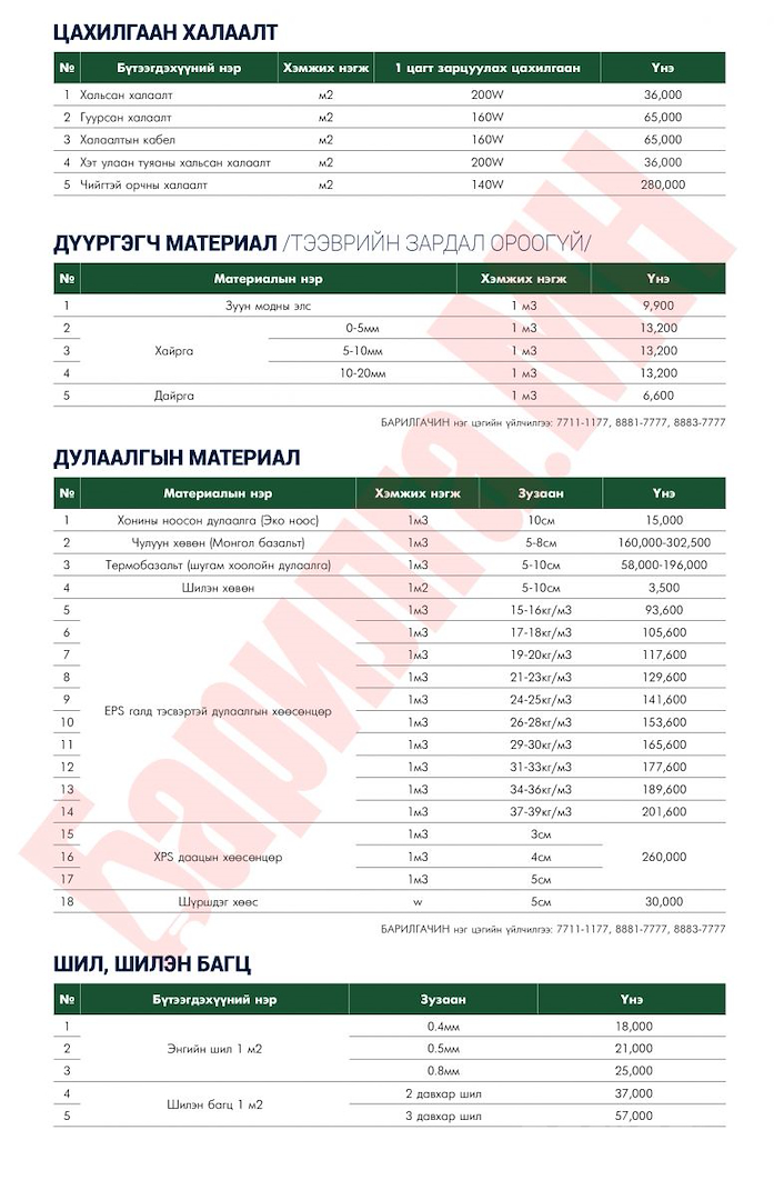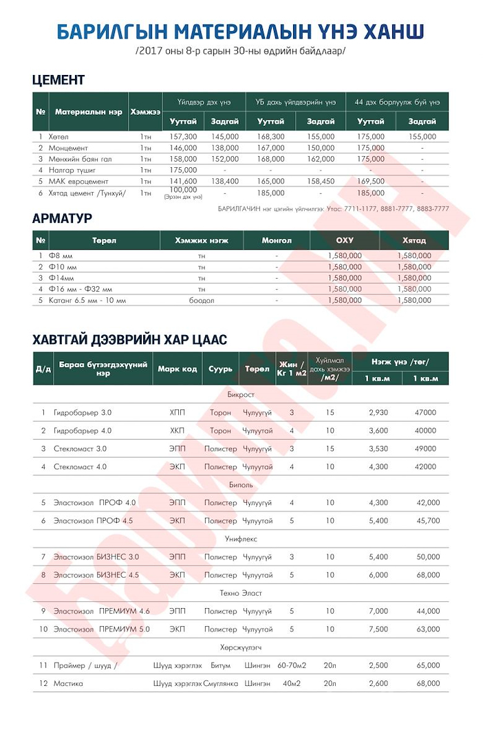 сэтгүүлээс сар бүр хүргэдэг барилгын материалын үнэ ханшийн мэдээллийг уншигч танд хүргэж байна. Илүү дэлгэрэнгүй мэдээлэл авахыг хүсвэл манай сэтгүүлийн 2017 оны 9-р сарын дугаар №88-aaс үзэх боломжтой.