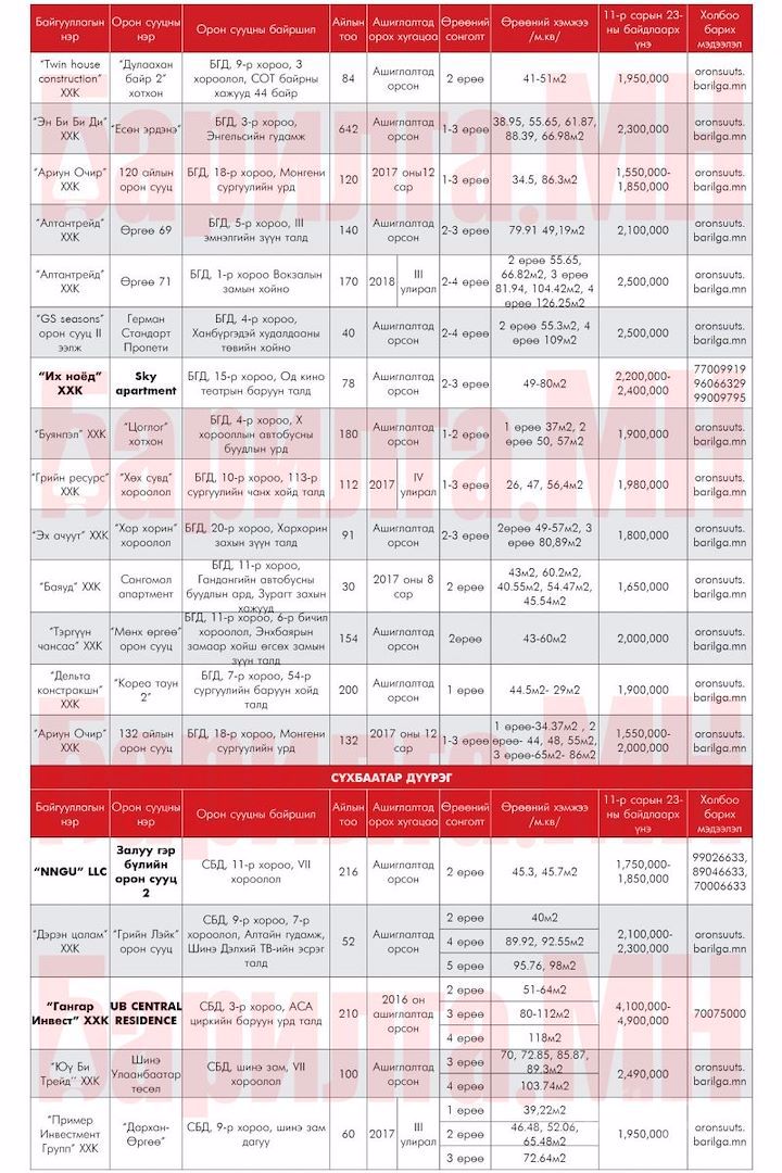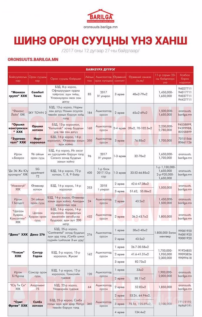 Улаанбаатар хотод захиалга авч буй ШИНЭ ОРОН СУУЦНЫ үнэ ханшийн мэдээлэл