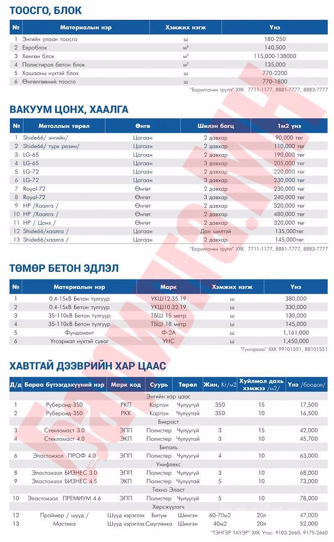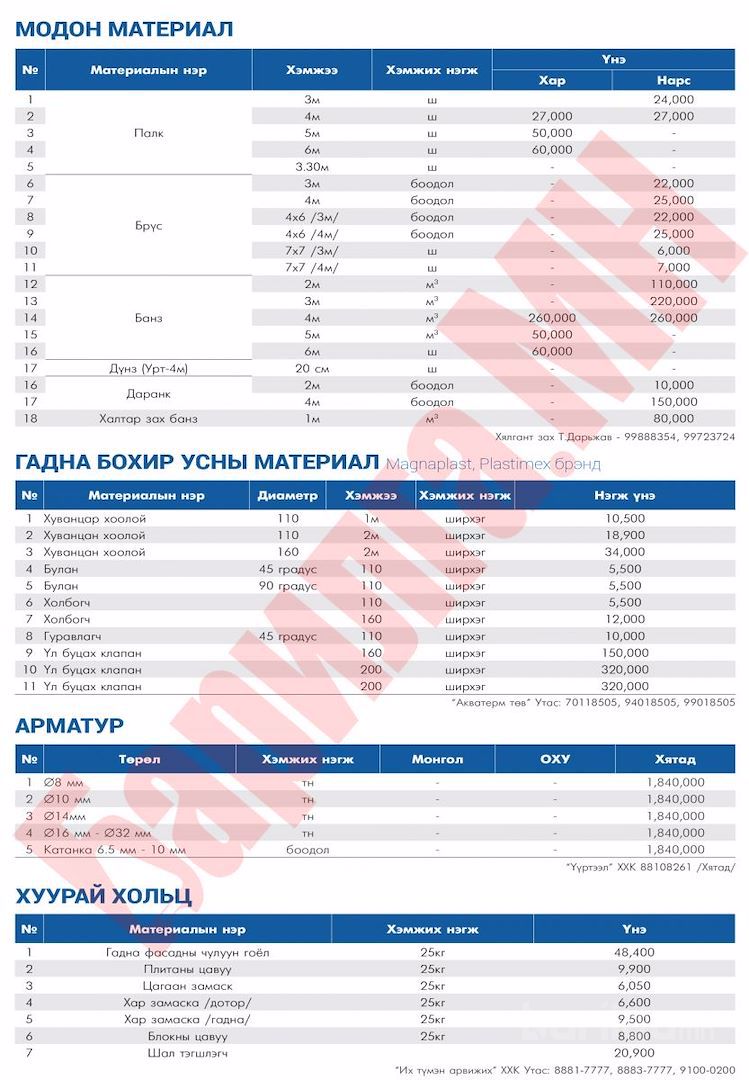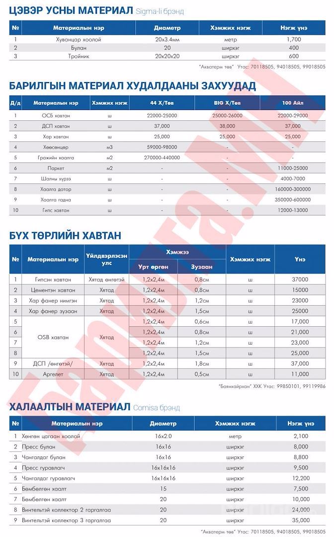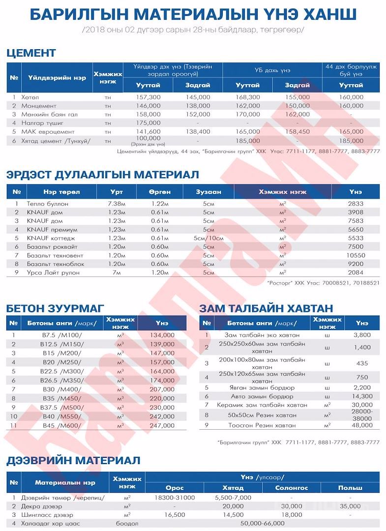 сэтгүүлээс сар бүр хүргэдэг барилгын материалын үнэ ханшийн мэдээллийг уншигч танд хүргэж байна. Илүү дэлгэрэнгүй мэдээлэл авахыг хүсвэл манай сэтгүүлийн 2018 оны 3-р сарын дугаар №94-aaс үзэх боломжтой.