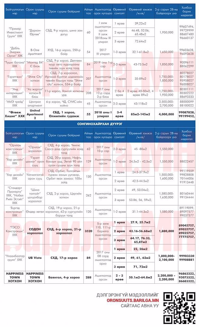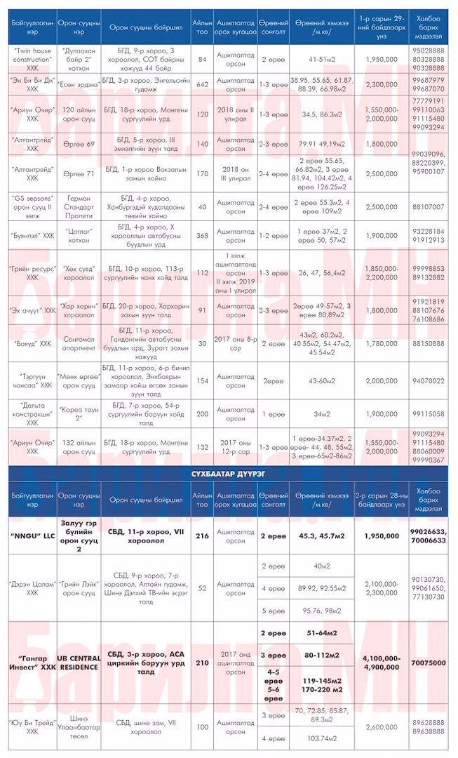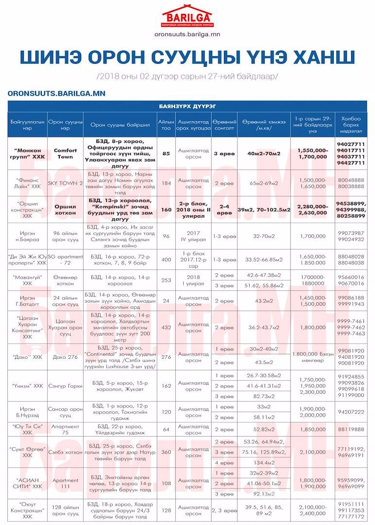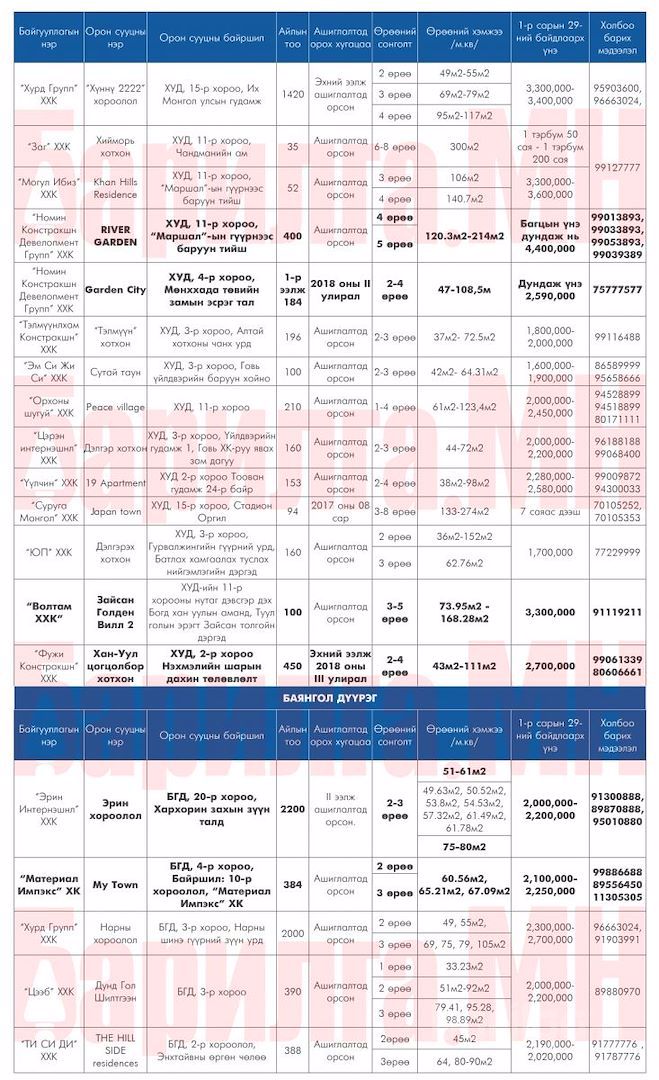 Улаанбаатар хотод захиалга авч буй ШИНЭ ОРОН СУУЦНЫ мэдээлэл 2018 оны 2 сар