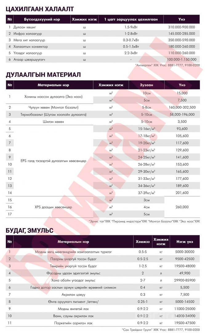 сэтгүүлээс сар бүр хүргэдэг барилгын материалын үнэ ханшийн мэдээллийг уншигч танд хүргэж байна. Илүү дэлгэрэнгүй мэдээлэл авахыг хүсвэл манай сэтгүүлийн 2018 оны 2-р сарын дугаар №93-aaс үзэх боломжтой.